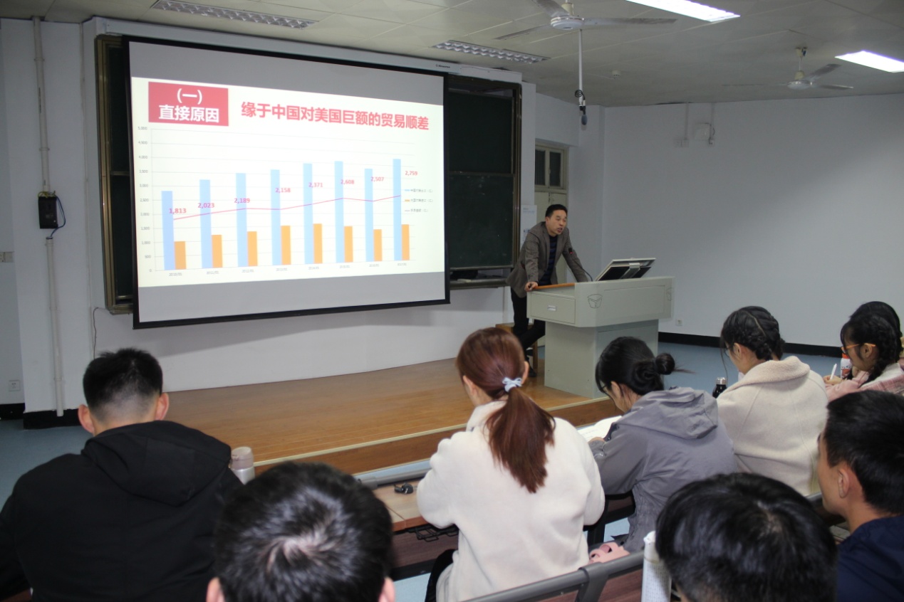 11月21日晚上,明升MS88官网2019年研究生学术活动月“读原著学原文悟原理”系列校内讲座第三场在人文楼408教室举行,由王帆宇博士做《新时代中国外交面临的机遇、挑战与对策——以中美贸易摩擦为例》专题讲座。明升MS88官网全体研究生参加了讲座。