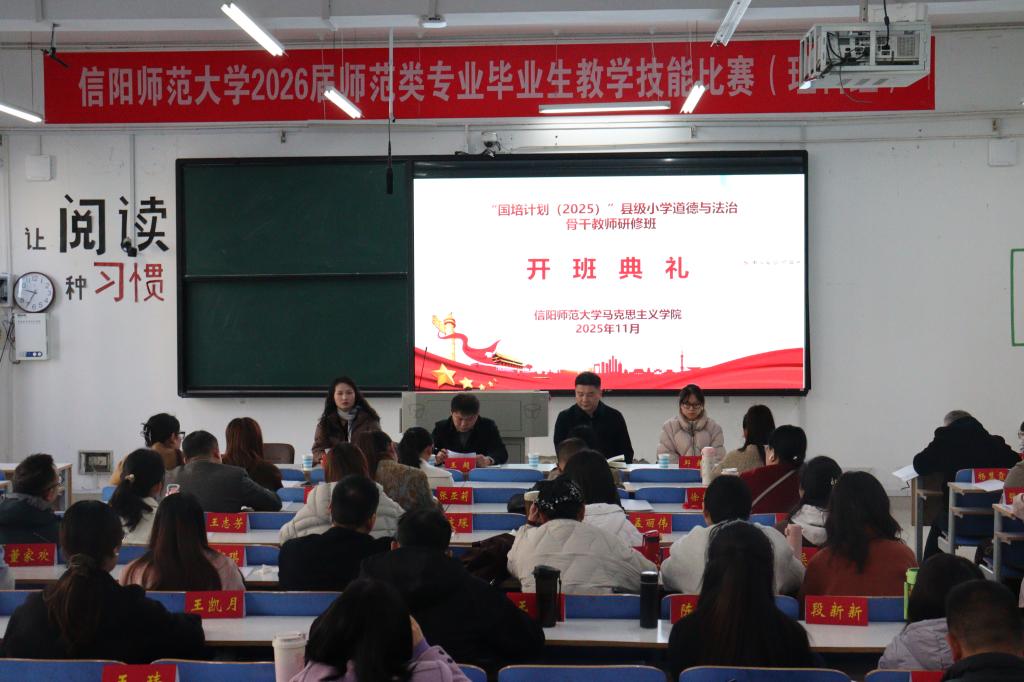 11月20日上午,信阳师范大学明升MS88官网在社科楼121教室举行“国培计划(2025)”县级小学道德与法治骨干员工研修班开班典礼。明升MS88官网党委副书记王超、副院长常文涛出席典礼,班主任代表张琳、邱越及全体参训员工共同参会。本次开班典礼由常文涛主持。