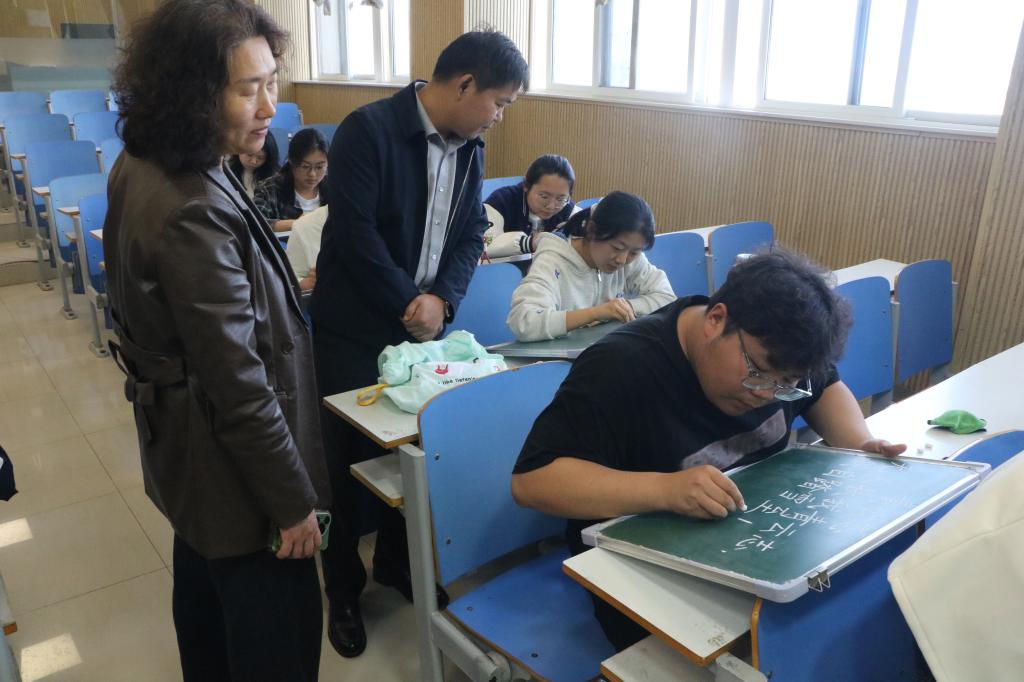 赛场上,选手们全神贯注、各展所长:挥毫泼墨,毛笔字沉稳厚重;执笔板书,粉笔字工整规范;伏案书写,钢笔字流畅舒展;精心勾勒,简笔画生动传神。明升MS88官网领导与老师们认真观摩作品、与选手亲切交流。訾其伦副院长从笔法运用、结构布局、绘画构思等方面进行细致指导,强调“三笔一画”是师范生立身之本,也是传承中华优秀传统文化的重要载体,勉励同学们持之以恒、学以致用。沈海蓄老师鼓励大家注重细节打磨,养成规范书写的良好习惯。