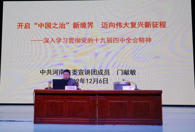 专题宣讲中,门献敏教授以“开启中国之治新境界,迈向伟大复兴新征程——深入学习贯彻党的十九届四中全会精神”为题,着重从“充分认识党的十九届四中全会召开的重要历史意义、深刻理解党的十九届四中全会的鲜明主题、科学把握中国特色社会主义制度的辉煌成就及显著优势、全面理解坚持和完善中国特色社会主义制度、推进国家治理体系和治理能力现代化的总体目标及战略部署、准确把握党的领导是推进国家治理体系现代化的关键和根本、推动党的十九届四中全会精神在信阳大地落地生根”等六个方面作了全面系统宣讲。报告主题鲜明、视野开阔、内容丰富、语言生动,宣讲报告既注重理论的深度、也有生动的事例。门献敏教授的宣讲报告受到基层党员干部和高校师生的良好赞誉,既完成了政治宣讲任务,也扩大了我校的社会影响。