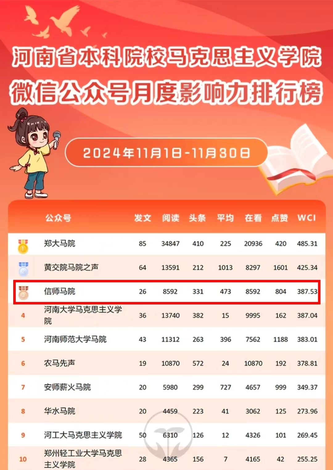 运营成果显著。一是发表内容丰富,2024年“信师马院”公众号严格贯彻落实“三审三校”制度,共推出205篇原创微信推文。二是推文质量提高,文章的平均阅读量显著提高,单篇最高阅读量达1584次,众多优质内容受到主流媒体的关注与转载。三是影响范围广泛,“豫教思语”平台转载5篇,单篇阅读量达2938次,在河南省本科院校明升MS88官网月度影响力排行榜中表现亮眼,长期稳居榜单前十,11月位居榜单第三名。