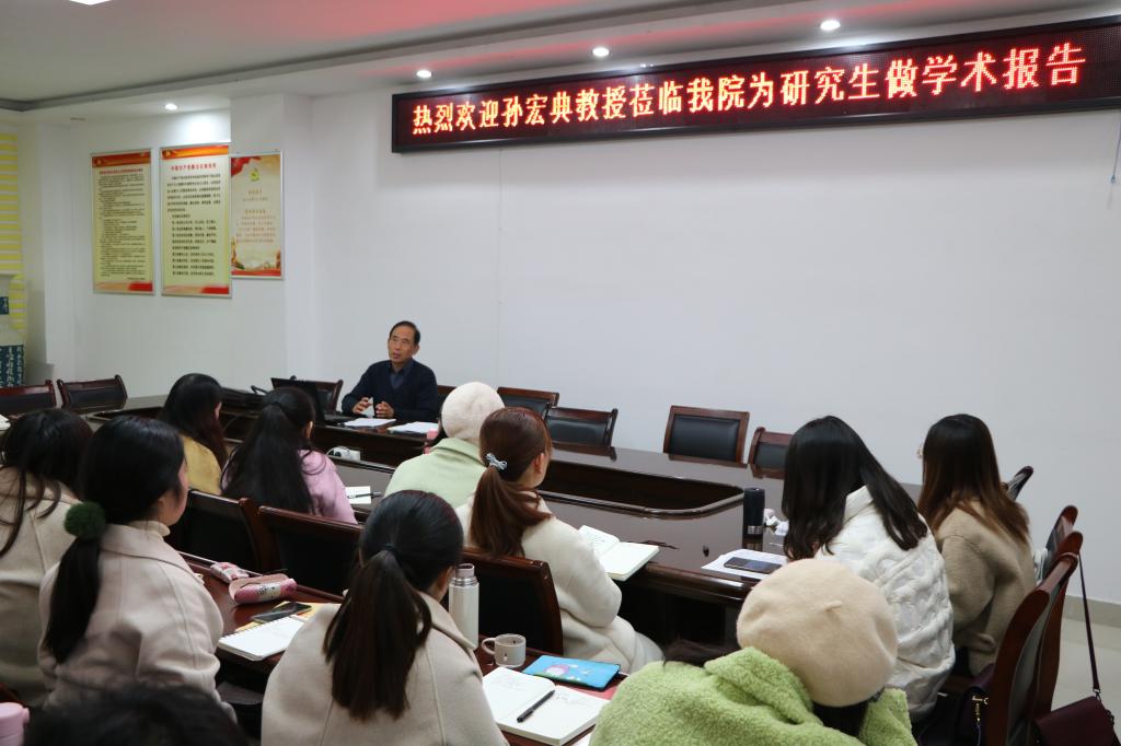 11月26日下午,应明升MS88官网邀请,我校原党委书记孙宏典教授在社科楼323会议室做《谨防思维中的陷阱》的学术报告。明升MS88官网全体研究生到场聆听,黄世明副院长主持报告。
