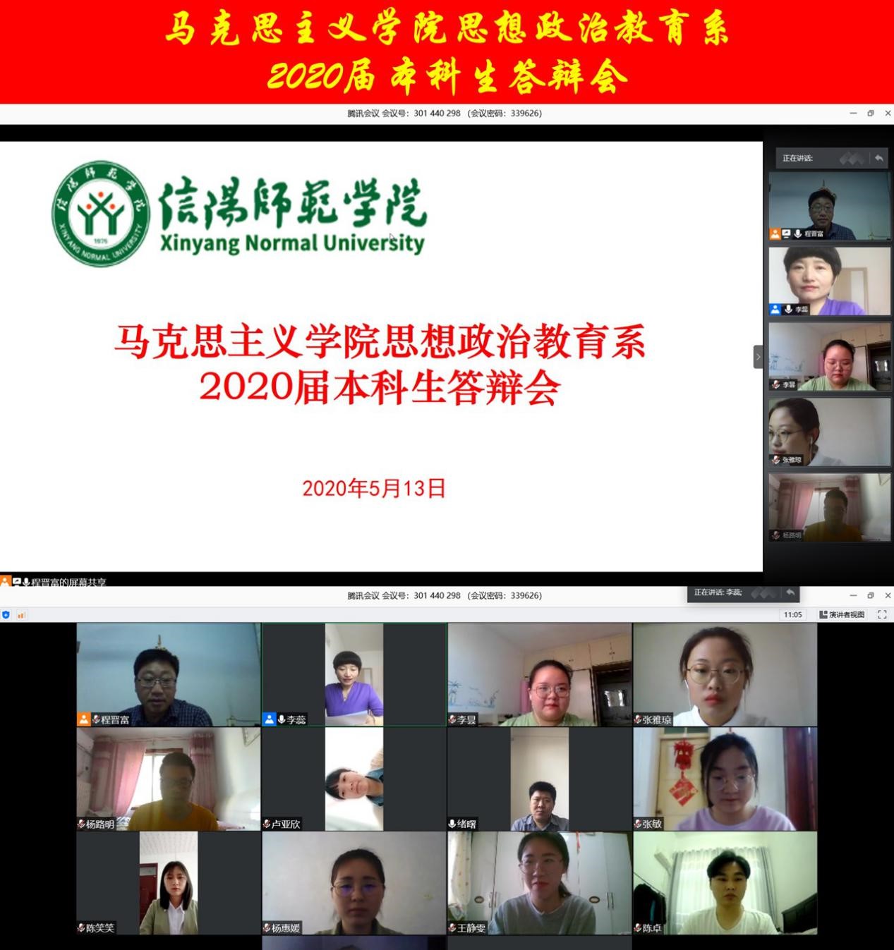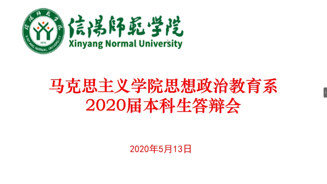搏“疫”在线,辩出精彩。按照教务处《关于做好2020届本科毕业论文(设计)有关工作的通知》及《明升MS88官网关于2020届思想政治教育专业本科毕业论文答辩工作的通知》要求,明升MS88官网思想政治教育教研室于5月13日通过腾讯会议平台开展了2020届本科生毕业论文线上答辩会议,程晋富、李蕊、孙绪曙作为答辩专家组老师参加会议,张雅琼、吴素豫、杨惠媛、李昙、卢亚欣、张敏、杨路明、陈笑笑、陈卓、王靖雯10名同学参加了答辩,答辩持续时长近三个小时。会议由李蕊主持。