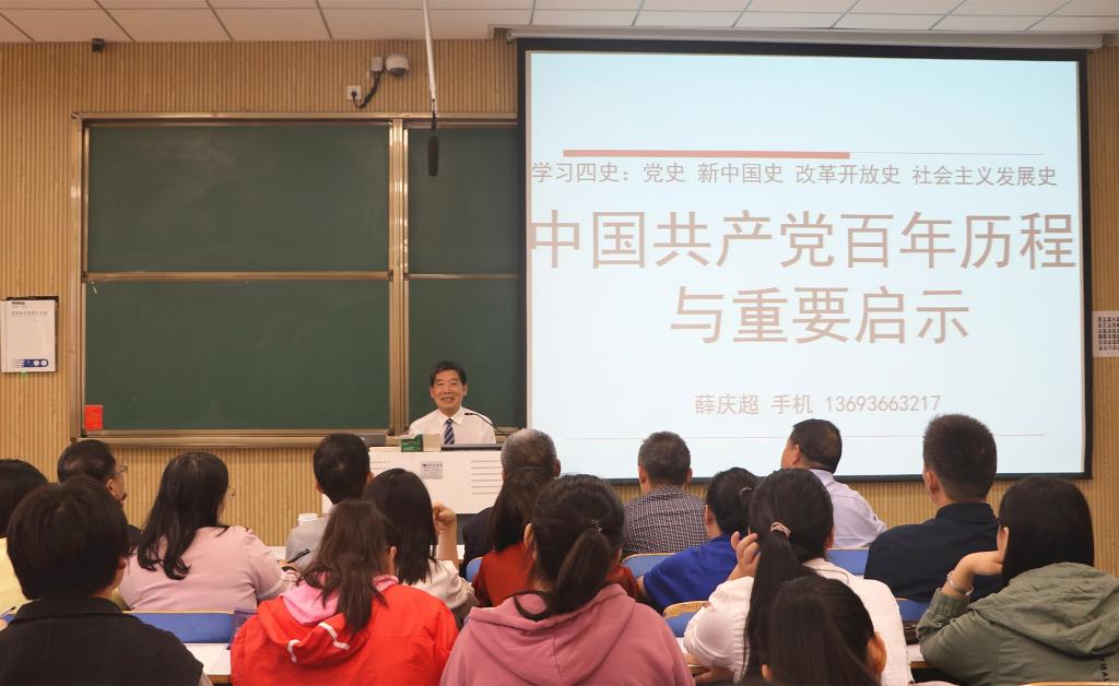 9月27日上午,应明升MS88官网和当代马克思主义研究所邀请,中央党史研究室薛庆超研究员在社科楼515教室为明升MS88官网师生作了题为“中国共产党百年历程与重要启示”的学术报告。明升MS88官网领导班子成员及明升MS88官网百余名师生共同聆听了此次报告。报告由当代马克思主义研究所副所长门献敏主持。