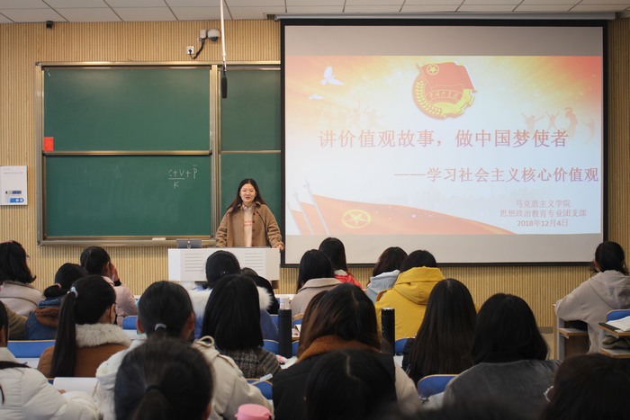 首先,刘冰以2017年2016级思想政治教育二班家庭经济困难认定工作为例,宣讲了社会主义核心价值观“公正”的内涵与意义。她表示,认定工作小组组长何晓坚以身作则、以个人公正之魅力影响着班级同学。我们应该积极弘扬“公正”这一价值观,彰显中国青年刚正不阿的气魄精神。随后,2018级六名同学引用古今中外的事例,分享了自己对社会主义核心价值观的独特见解,向大家传递了生活中的价值观精神。最后,黄子晋对此次团课进行总结,她指出,作为大员工,我们要将社会主义核心价值观内化于心,外化于形,深刻领会价值观精神,用其指导我们的实践。