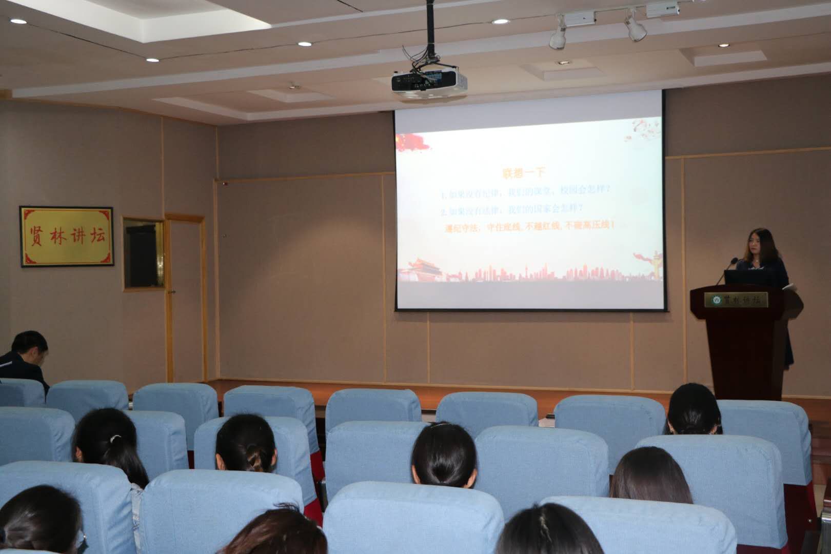 首先,何晓坚从校规校级和学习规划两方面进行讲述。他以“五个零容忍”为切入点,强调全体新生应增强安全防范意识,严格遵守校规校纪,要求各班班委端正工作态度,发挥模范带头作用。他从打牢英语基础、改良学习方法、构建思政话语体系三个方面向全体新生指明今后的学习方向。接着,新生代表吕昂与参会同学分享了自己的大学感悟以及未来规划。优秀研究生代表王秋铮和本科生代表王雅纯建议全体新生利用大学提供的平台提高核心能力,在对自己清晰定位的基础上抓住机会,迎接挑战,合理安排自己的课余时间,使自己的大员工活多姿多彩。最后,陶青青老师再次强调了遵纪守法,守住底线的重要性,并从八个方面阐述校规校纪。她重点提到安全方面的问题,要求全体新生自觉遵守宿舍规章制度,不使用违规电器,保护好个人财产,注意网络安全,培养健康心理。