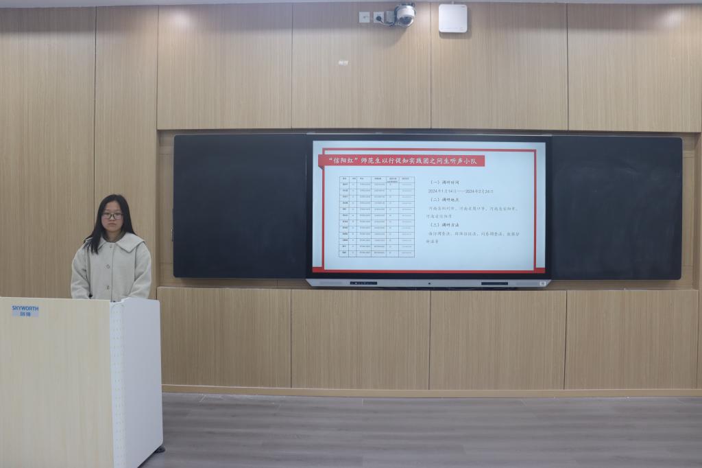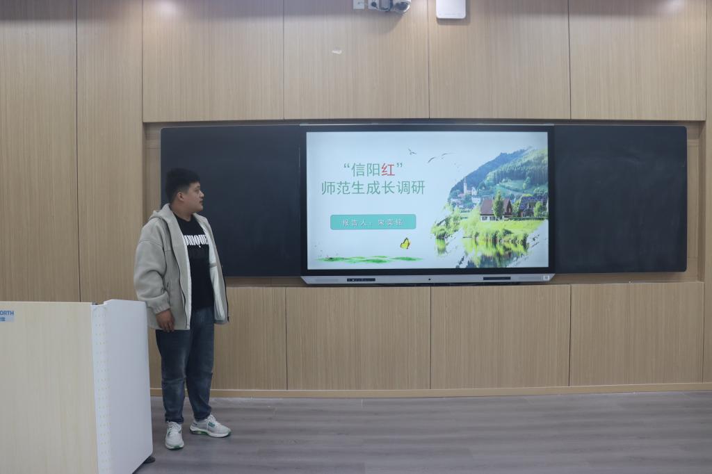 会议伊始,杨可介绍了本次“信阳红”师范生成长调研活动的宗旨和意义。接着,五组代表依次上台进行汇报演讲。调研小组多通过同资深员工对话、交流等形式加强自身对员工素养、员工水平、员工情怀等方面的理解,结合实践调研经验深度剖析师范生在教育实践中遇到的困难挑战并提出针对性建议。其中“问生听声”小组采取线上调查问卷、线下访谈相结合的调研方式,从采访师范生这一角度切入,对三所学校二十多位不同年级的在读师范生展开座谈,并在中期实践中采取“一对多”的对话模式引导同学们进行思想碰撞,推动理论知识转化为实际应用能力。