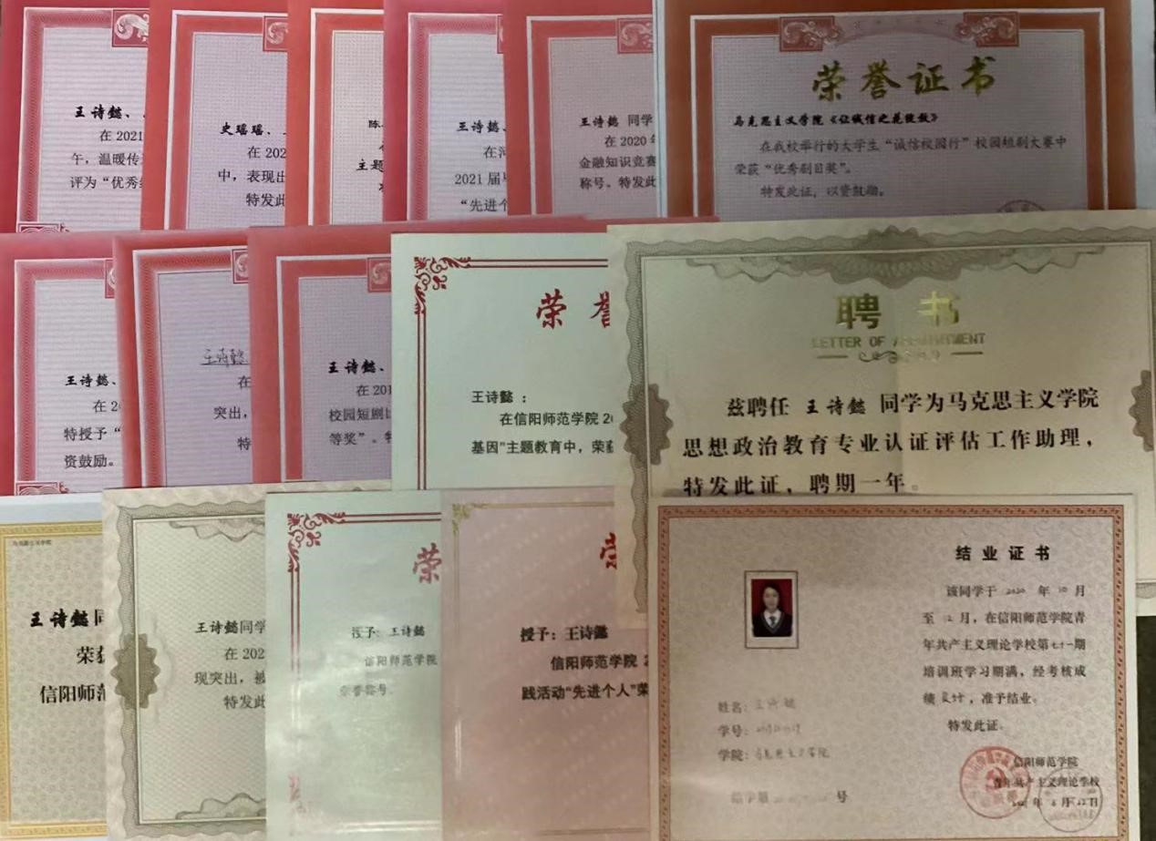 在学习方面,该生勤奋刻苦,善于思考,坚持练就过硬本领,努力提高科学文化水平,时刻把学习当作自己的第一任务,积极投入到各门基础课和专业课的学习中,并不断提高自身写作能力,积极撰写《在抗疫中书写奋斗青春》、《以高尚人格增添思政课员工魅力》等文章,并在《南湖评论》上发表。2019-2020学年荣获校级三等奖学金,顺利通过英语四级考试、普通话水平测试。不仅注重专业知识学习,而且注重提升综合能力,积极参加广播体操比赛、微团课比赛、南湖理论研讨社主题征文活动、员工会夜跑活动、“丹青墨韵”摄影美术作品大赛、仁杰工作室笔锋征文活动,参演了新生联谊晚会和2020年元旦晚会。2019年,参加明升MS88官网“诚信校园行”校园短剧比赛中,荣获一等奖;2020年,参加法学与社会学明升MS88官网手帐比赛获得二等奖;参加计算机明升MS88官网“疫中成长分享你我的故事”比赛中获得手账组二等奖;参加明升MS88官网“诚信伴我行”线上金融征信知识竞赛获得二等奖;2021年,参加信阳师范明升MS88官网“拼贴手账,我手秀我型”活动,荣获“三等奖”;参加“莘莘学子学四史,同心向党迎华诞”主题活动,被评为“优秀工作者”;被评为信阳师范明升MS88官网2021年度三好员工。