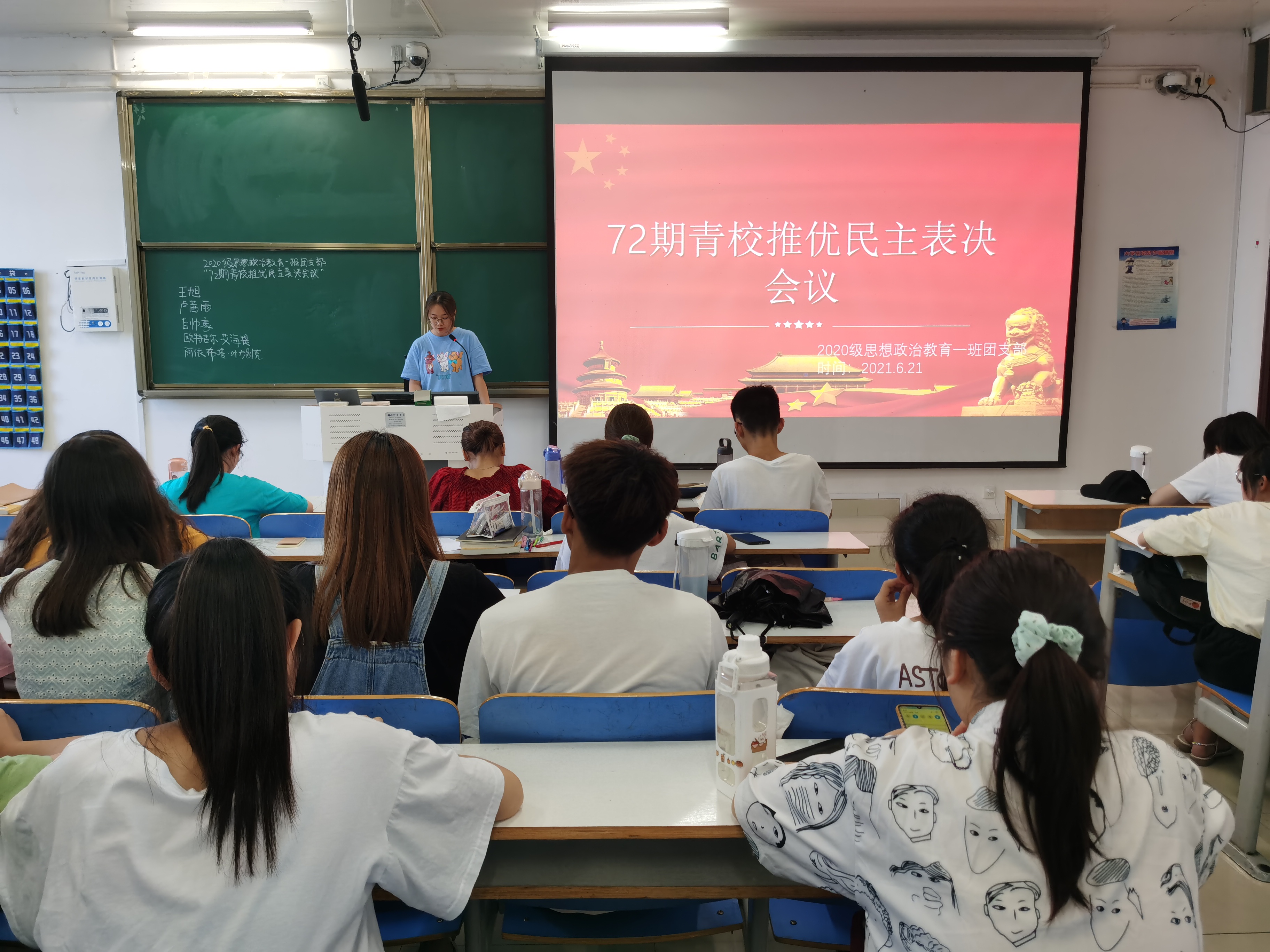 6月21日下午,明升MS88官网2020级思想政治教育一班在社科楼514教室召开72期青校推优表决会议,2020级思想政治教育一班全体团员参加本次表决会议,大会由团支书卢茜雨主持。