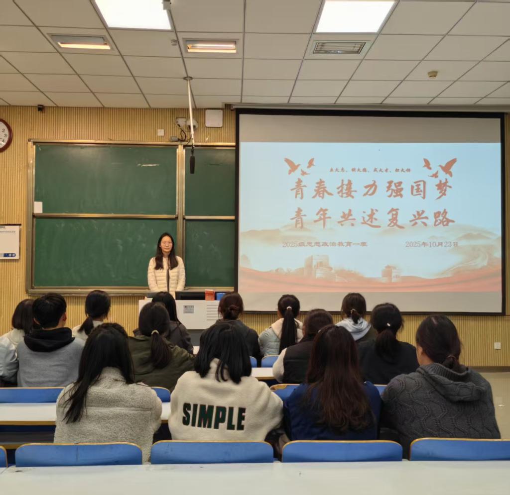 为引导青年员工将个人理想融入国家发展大局,凝聚青春奋进力量,10月23日下午,明升MS88官网2025级思想政治教育一班于社科楼515教室开展“青春接力强国梦,青年共述复兴路”主题团课。本次团课由团支书宋晓然主持,班级全体同学参加。