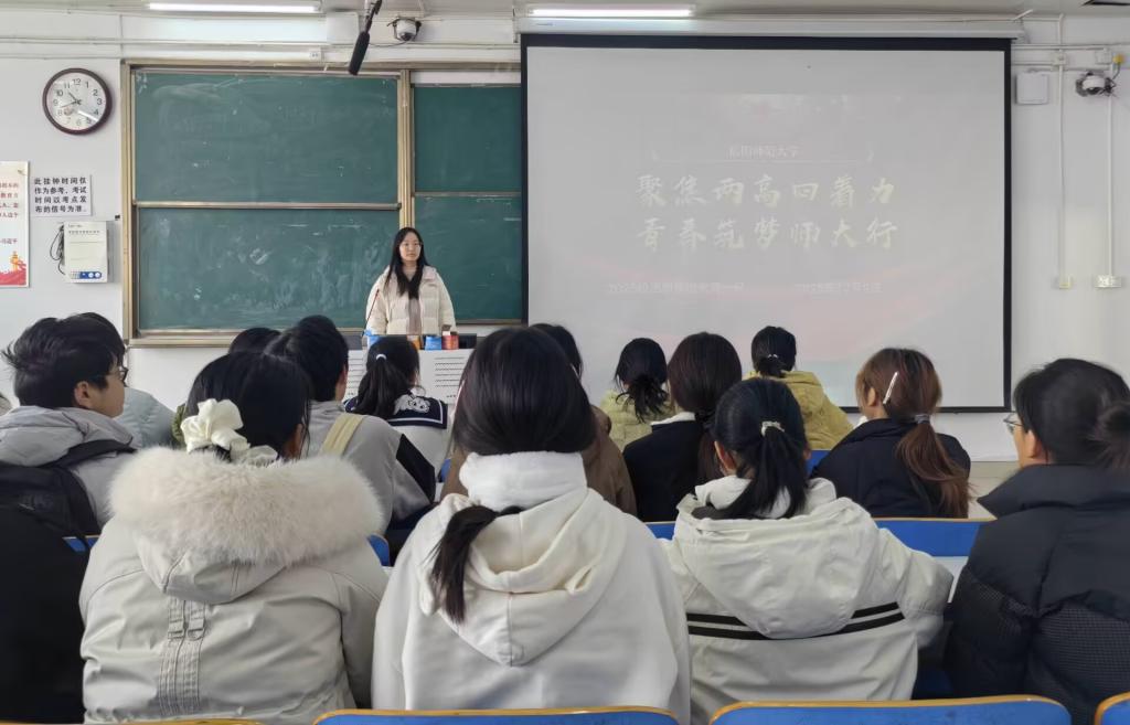 团课伊始,宋晓然详细解读“高质量发展、高水平自立自强”的“两高”战略要求,深入阐释“四着力”的核心内涵,结合师范专业特色与青年成长实际,重点剖析国家政策对青年大员工的殷切期许,让同学们深刻理解师范学子在强国建设中的责任担当,强化“躬耕教坛、强国有我”的信念。随后,员工代表分享学习感悟,结合自身学习规划畅谈如何将“两高四着力”要求融入日常,引发全场同学热烈讨论与强烈共鸣。团课尾声,宋晓然总结并提出期许,鼓励同学们以理论学习筑牢根基、以实践行动锤炼本领,在师大校园中筑梦成长,为教育事业与国家发展贡献青春力量。