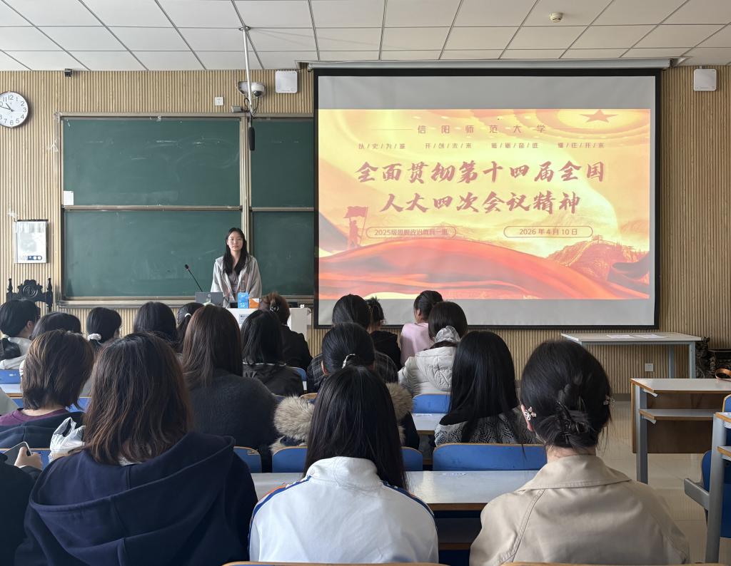 为全面贯彻第十四届全国人大四次会议精神,深刻领会 “十五五” 规划纲要核心要义,引导青年学子将个人成长融入强国建设的时代伟业,4 月 10 日上午,明升MS88官网 2025 级思想政治教育一班在社科楼 515 教室开展“全面贯彻第十四届全国人大四次会议精神” 主题团课。本次团课由团支书宋晓然主持,班级全体同学参与。