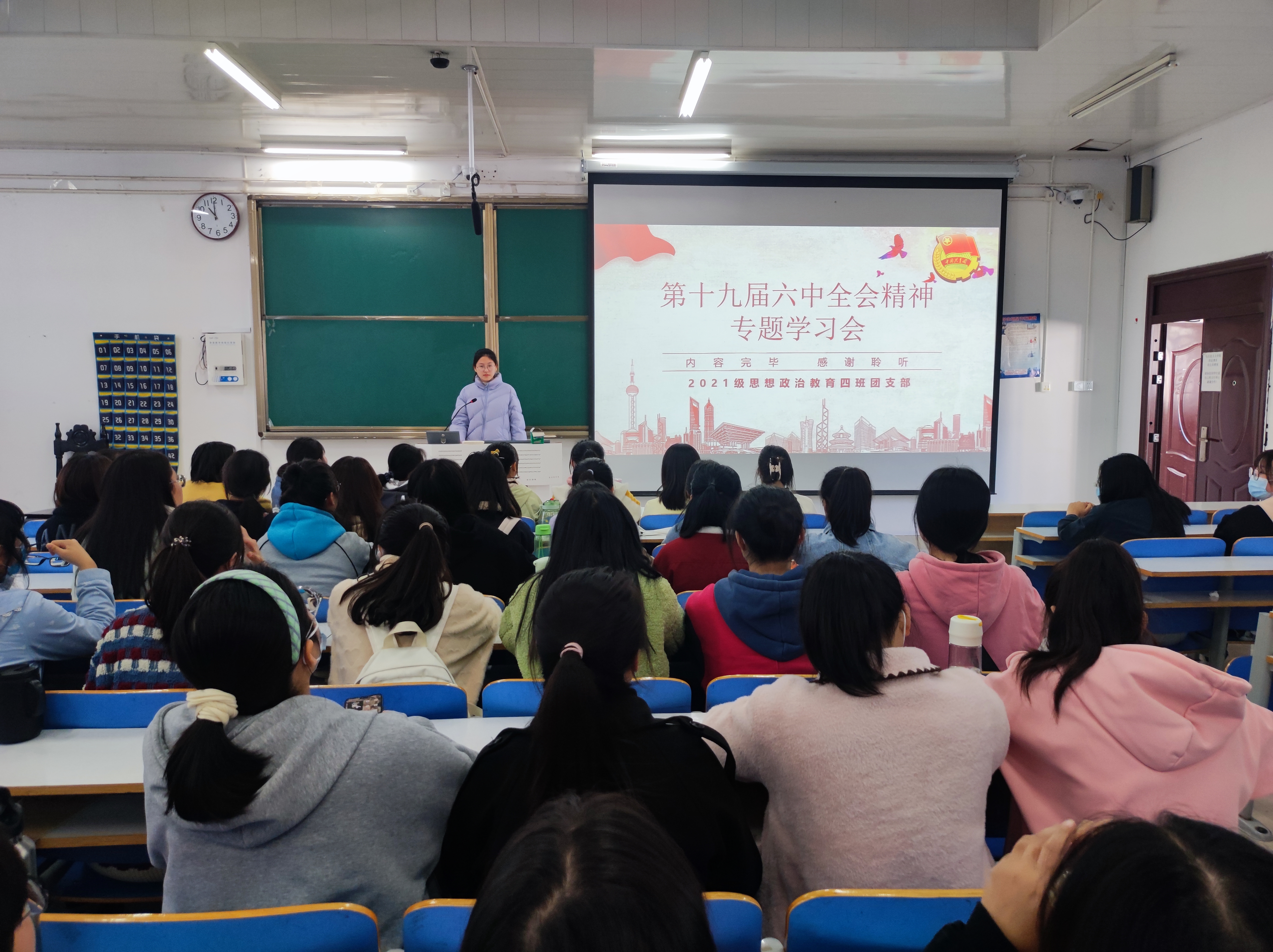 11月18日下午,明升MS88官网2021级思想政治教育四班在社科楼514教室召开十九届六中全会精神专题学习会,2021级思想政治教育四班全体同学参加了本次专题学习会。专题学习会由团支书刘珂含主持。