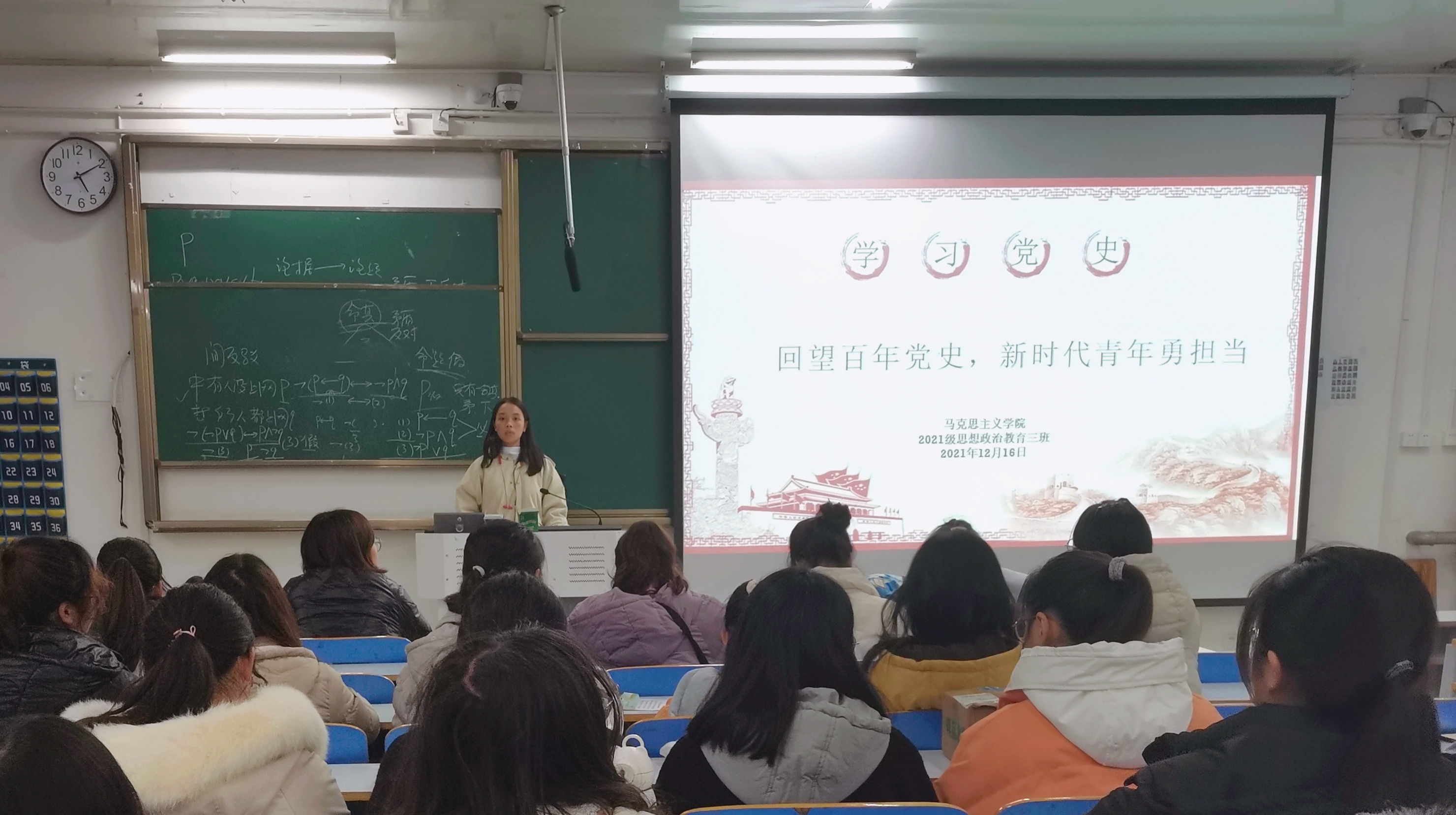 12月16日下午,明升MS88官网2021级思想政治教育三班在社科楼514教室举办“回望百年党史,新时代青年勇担当”主题团课。2021级思想政治教育三班全体团员参加了此次团课。团课由团支部副书记王岚霄主持。