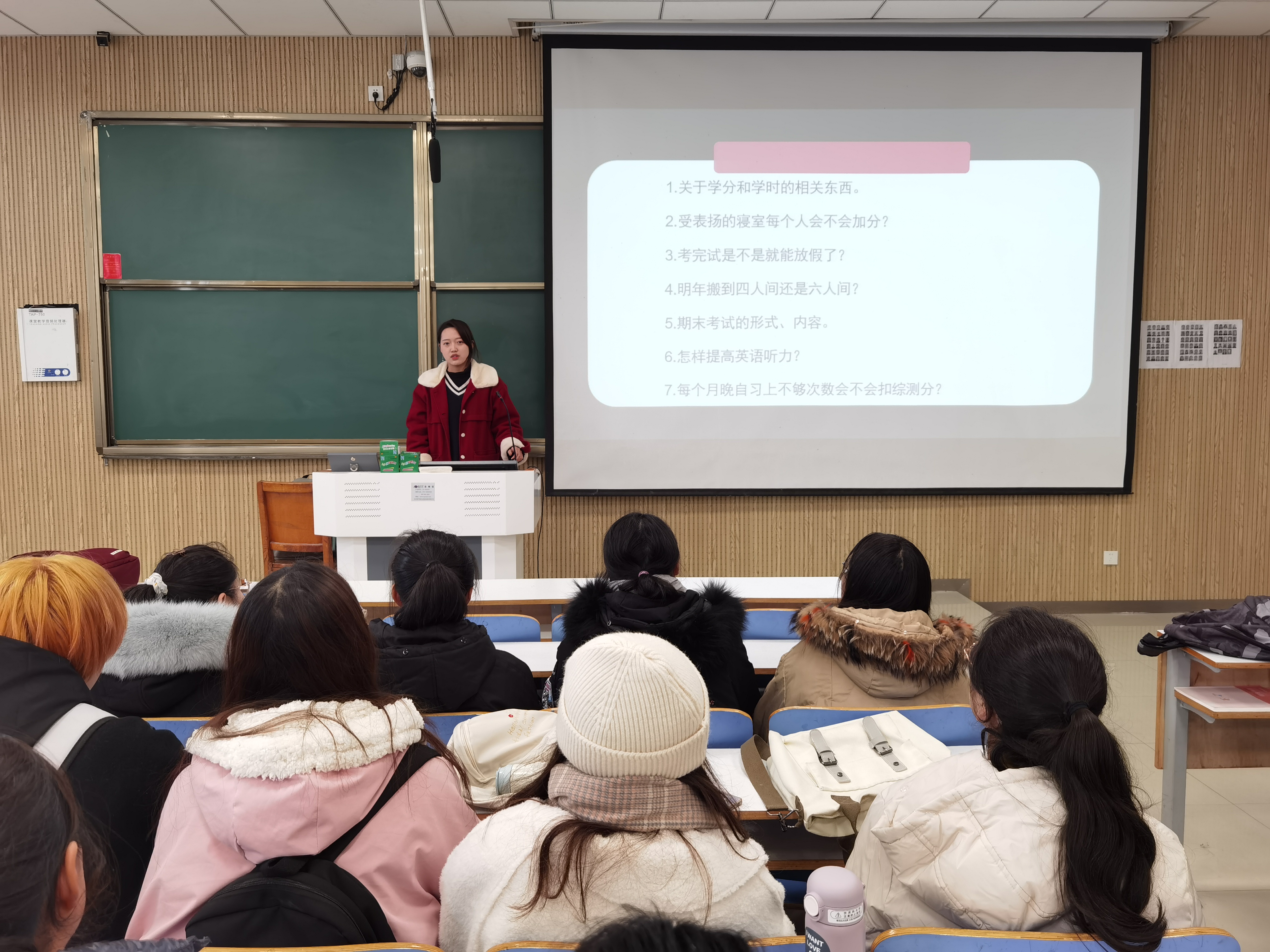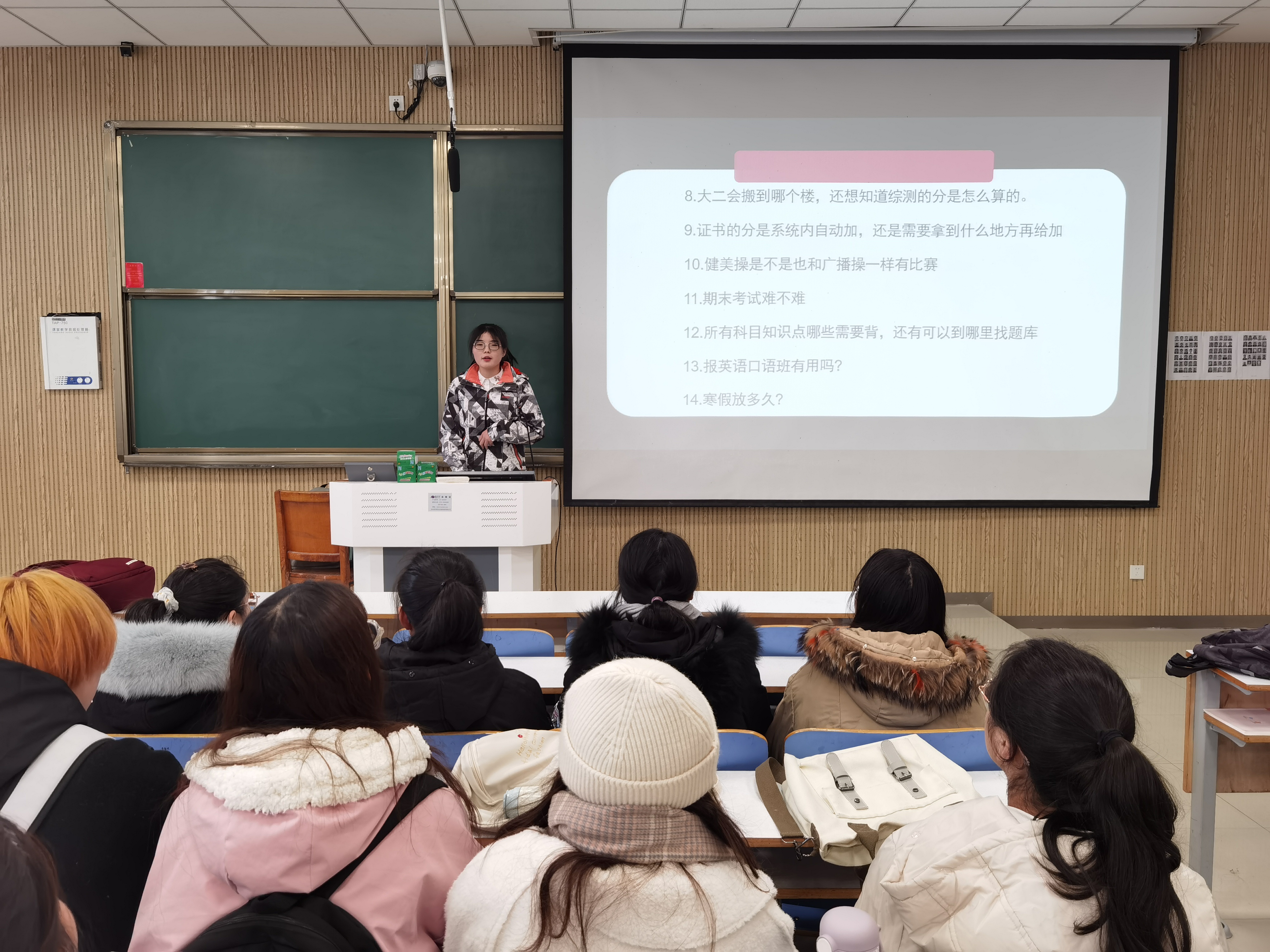 首先,陈宇航代表全体员工提出同学们近期在学习与生活上遇到的问题。随后,黄子晋、王文慧结合自身学习与生活经验,依次解答同学们的问题。其中,黄子晋悉心解答了有关第二课堂、住宿环境、考试形式几个方面的问题。她提出,同学们要认真学习本专业知识,提高自身专业素养,积极参加社团活动,培养个人综合素质和修养。王文慧从课程重点、英语口语、假期规划三个方面具体回答了同学们的问题,她建议同学们要多与学长学姐们沟通交流学习经验,充分利用英语学习软件提高英语水平,放假期间制定好学习计划,养成良好的学习与生活习惯。最后,陈宇航对本次活动做出总结,希望同学们根据以上意见和建议,合理规划大学学习与生活计划,并对黄子晋、王文慧的热心解答表示感谢。