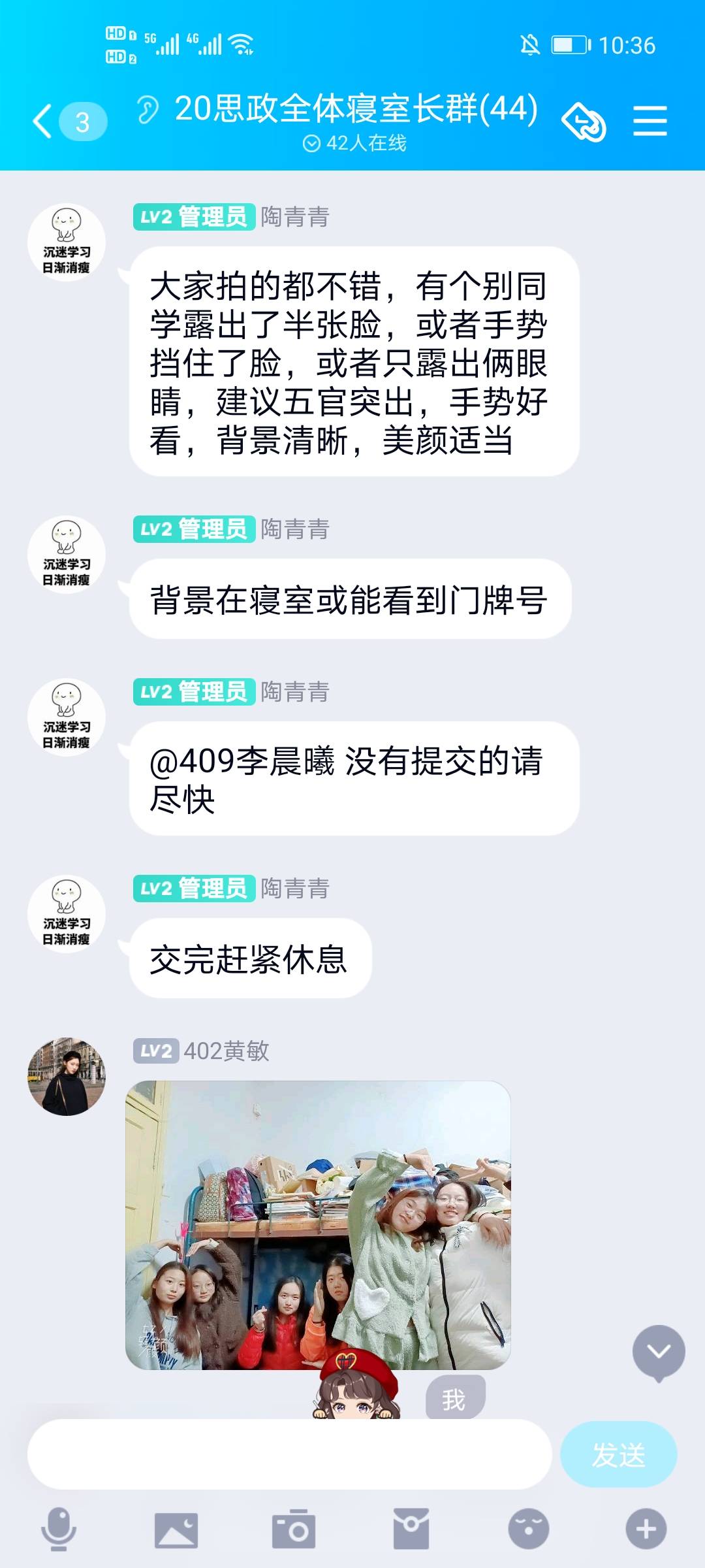 为了解我班同学住宿情况,督促同学们进一步树牢安全意识,12月14日与17日晚,明升MS88官网2020级思想政治教育二班班主任陶青青通过线上云查寝的方式对我班同学住宿情况展开深入检查。