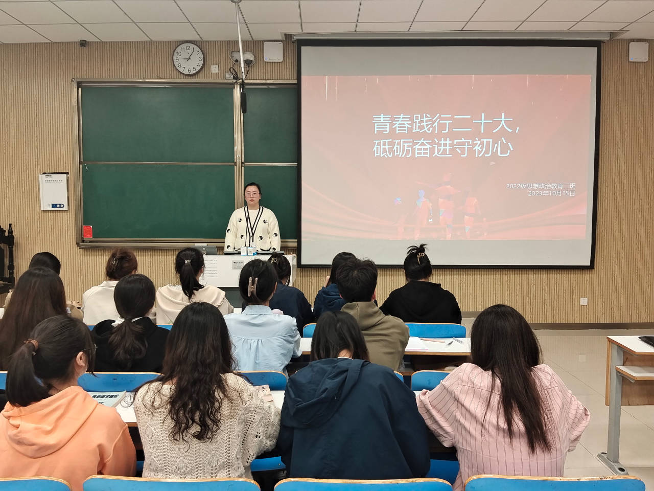 为深入学习贯彻党的二十大精神,加强班级同学思想建设,10月15日上午,明升MS88官网2022级思想政治教育二班在社科楼515教室召开“青春践行二十大,砥砺奋进守初心”主题团课。明升MS88官网2022级思想政治教育二班全体团员共同参加此次团日活动。活动由团支书李佳音主持。
