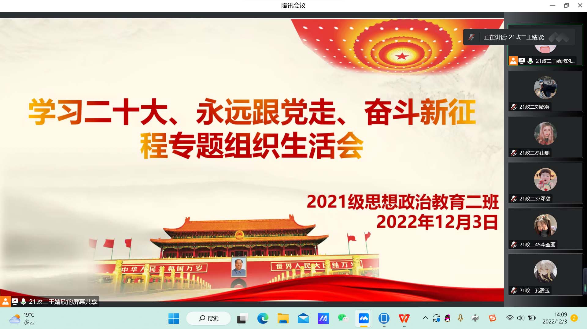 12月3日下午,明升MS88官网2021级思想政治教育二班团支部在腾讯会议召开学习二十大、永远跟党走、奋进新征程专题组织生活会。2021级思想政治教育二班全体团员参加此次组织生活会。组织生活会由团支书王婧欣主持。