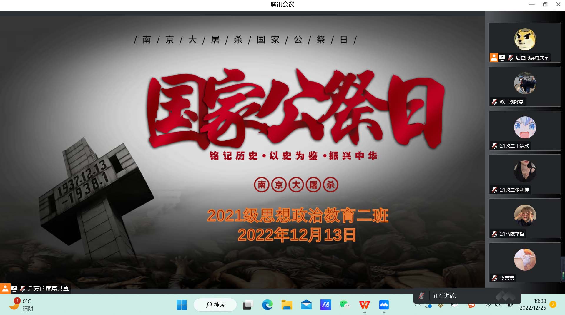 12月13日下午,明升MS88官网2021级思想政治教育二班在腾讯会议召开“铭记历史·以史为鉴·振兴中华”国家公祭日主题班会。2021级思想政治教育二班全体成员共同参加此次班会。班会由团支书王婧欣主持。