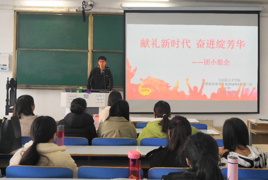 11月21日上午,明升MS88官网2018级思想政治教育一班第三团小组在社科楼514教室顺利开展“献礼新时代,奋进绽芳华”主题团会。第三团小组全体成员共同参加此次团会。此次团会由团小组组长丁一主持。