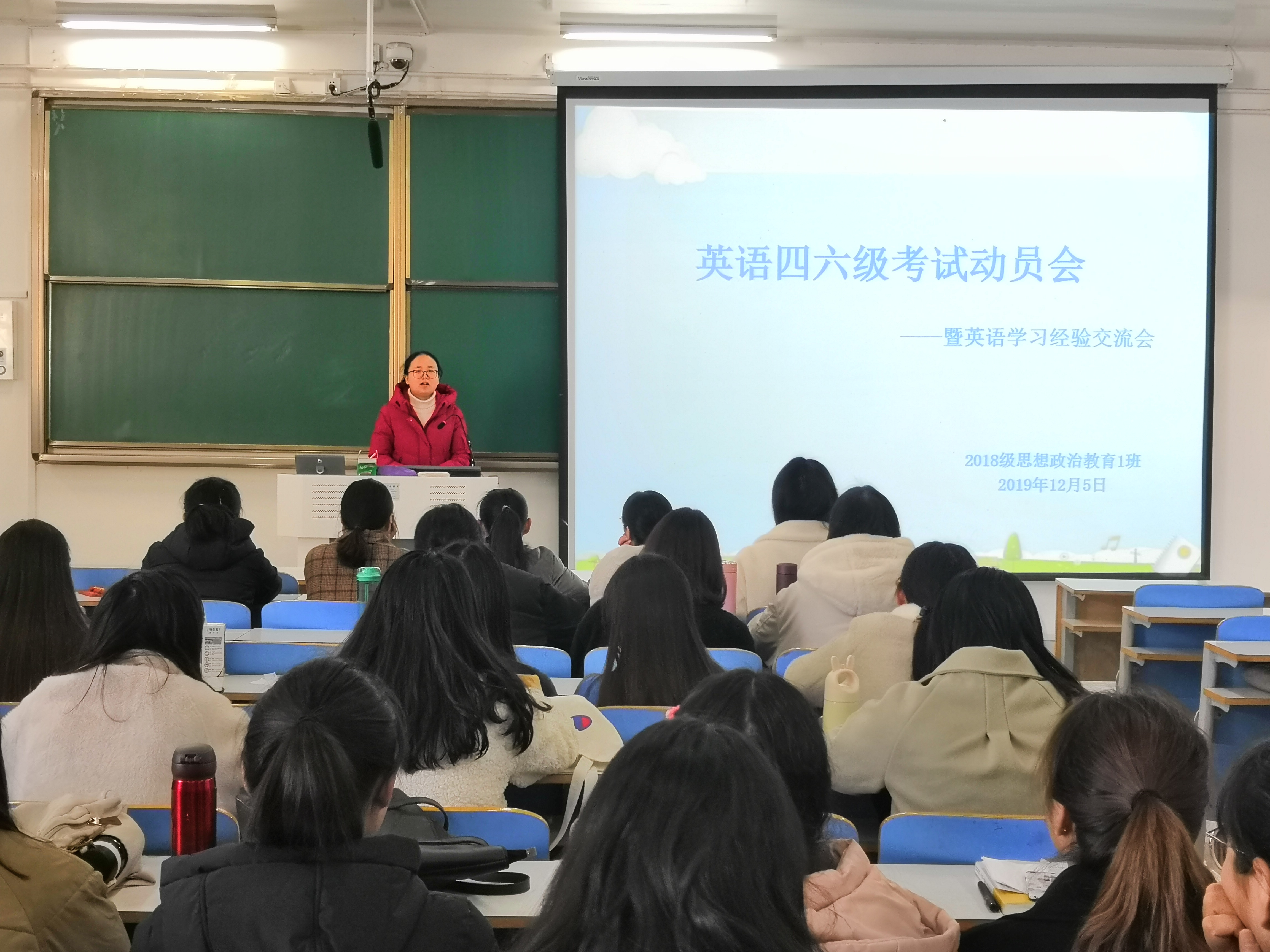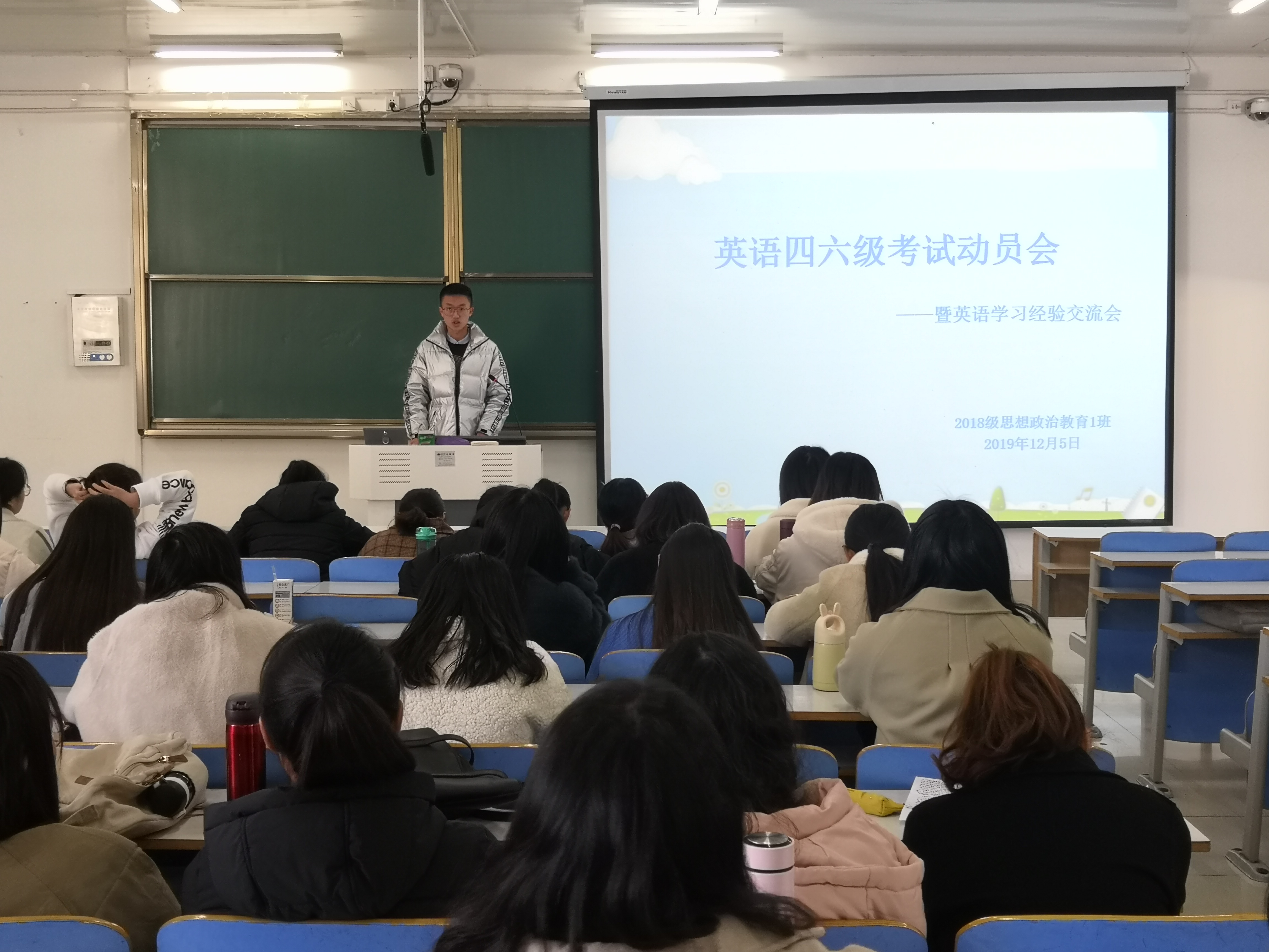 12月5日上午,明升MS88官网2018级思想政治教育一班在社科楼514教室顺利开展英语四六级考试动员会。2018级思政一班全体同学共同参加此次会议。此次会议由班长邢子豪主持。