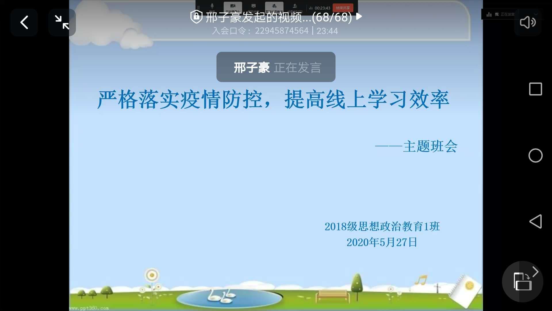 为严格落实班级的疫情防控工作,提高员工线上学习效率,5月27日上午,明升MS88官网2018级思想政治教育一班通过钉钉平台顺利开展“严格落实疫情防控,提高线上学习效率”线上主题班会。辅导员曹菁菁、2018级思想政治教育一班全体成员共同参加了此次班会。班会由班长邢子豪主持。