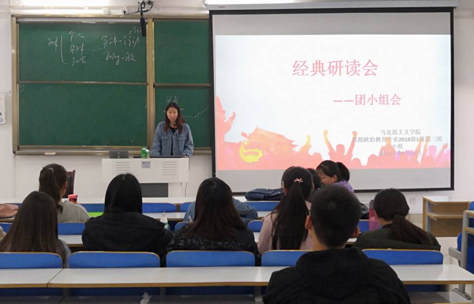 10月15日上午,明升MS88官网2018级思想政治教育一班在社科楼514教室顺利开展“经典研读会”特色活动。2018级思想政治教育一班全体同学共同参加此次活动。活动由文体委员丁一主持。