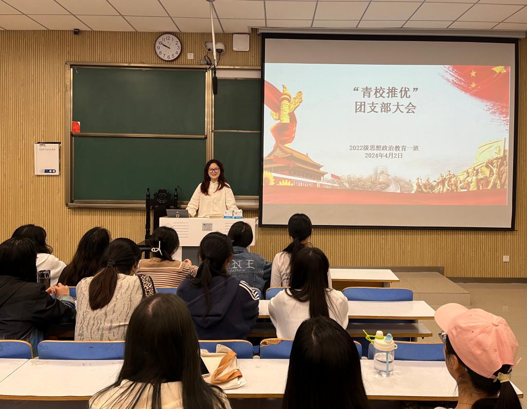 4月2日上午,明升MS88官网2022级思想政治教育一班在社科楼515教室召开“青校推优”团支部大会,明升MS88官网2022级思想政治教育一班全体同学共同参与本次会议,会议由团支书李佳茹主持。