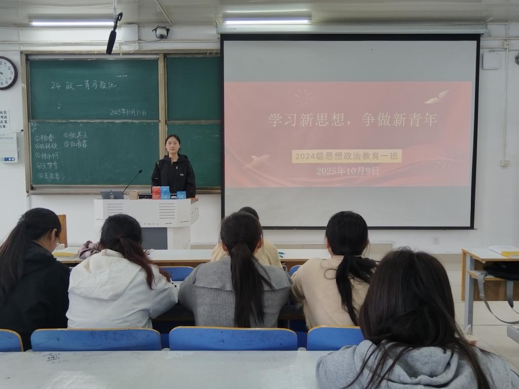 为激励我班同学深入学习和贯彻习近平新时代中国特色社会主义思想,将党的智慧结晶同个人发展实际相结合,以实际行动实现人生理想和民族复兴,10月9日上午,明升MS88官网思想政治教育一班于社科楼515教室开展“学习新思想,争做新青年”主题团课。本次团课由团支书李冉主持,一班全体同学参加。