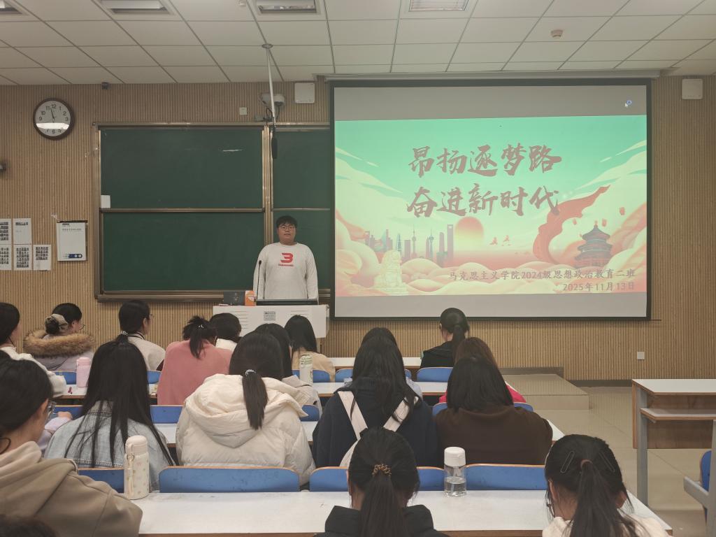 为深入引导青年员工锚定理想航向、勇担时代使命,切实将个人成长融入国家发展大局,11月13日下午,明升MS88官网2024级思想政治教育二班在社科楼515教室开展“昂扬逐梦路,奋进新时代”主题团课。本次团课由团支书王志颖主持,二班全体同学全程参与、积极互动。