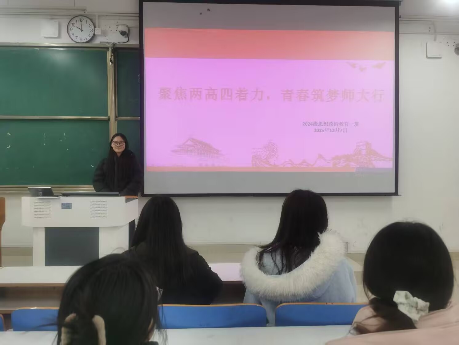 为深入领会“四高四着力”发展要求,凝聚我班学子奋进力量,12月7日上午,明升MS88官网2024级思政一班于社科楼514教室开展“聚焦四高四着力,青春筑梦师大行”主题团课。本次团课由团支书李冉主持,一班全体同学参加。