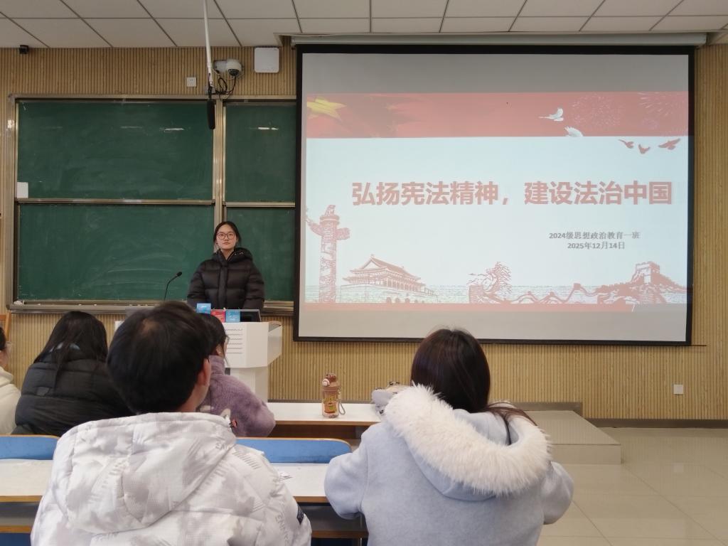 为增强我班员工的宪法意识和法治素养,筑牢法治信仰根基,12月14日上午,明升MS88官网2024级思政一班于社科楼514教室开展“弘扬宪法精神,建设法治中国”主题团课。本次团课由一班团支书李冉主持,一班全体同学参加。