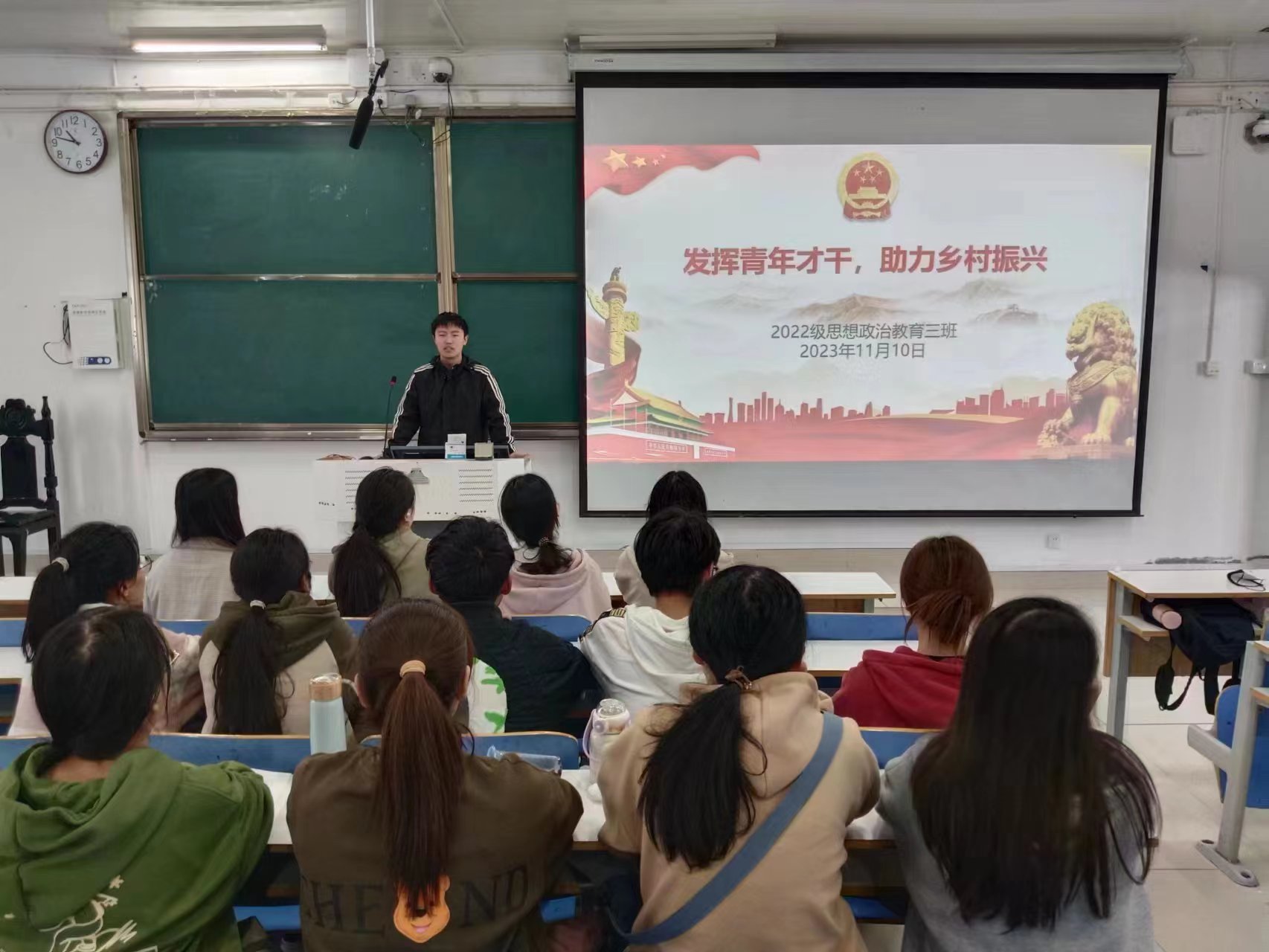 11月10日上午,明升MS88官网2022级思想政治教育三班在社科楼514教室召开“发挥青年才干,助力乡村振兴”主题团课。明升MS88官网2022级思想政治教育三班全体成员共同参与本次团课,团课由团支书余浩洋主持。