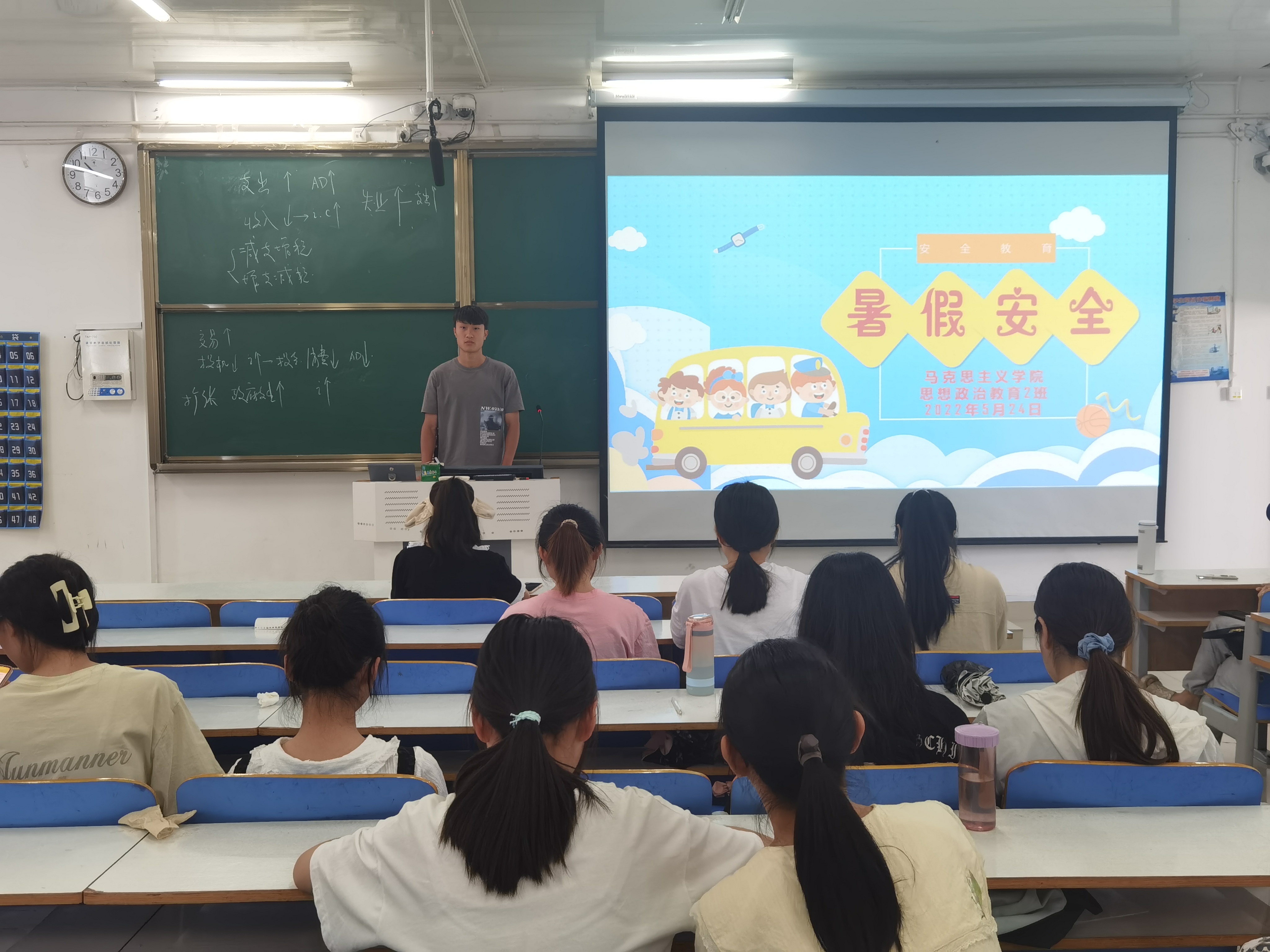 会议伊始,陈宇航强调了暑期来临之际召开本次安全教育主题班会的重要意义。他利用幻灯片放映的方式具体讲述了交通、饮食、水、电、火等五个方面的安全知识及注意事项,他表示,同学们在暑假期间要提高防火、防溺水等安全意识,避免发生火灾、交通等安全事故,注意各种网络诈骗,辨别打工陷阱,防止误入传销组织等。随后,陈宇航重点强调疫情防控的重要性,他指出,同学们在暑假期间要特别注意疫情防控,非必要不外出,时刻关注自身健康状况,按时完成健康打卡。班会最后,陈宇航向同学们分发了《暑期安全员工承诺书》《暑期安全家长告知书》,并提醒同学们认真阅读、积极落实。