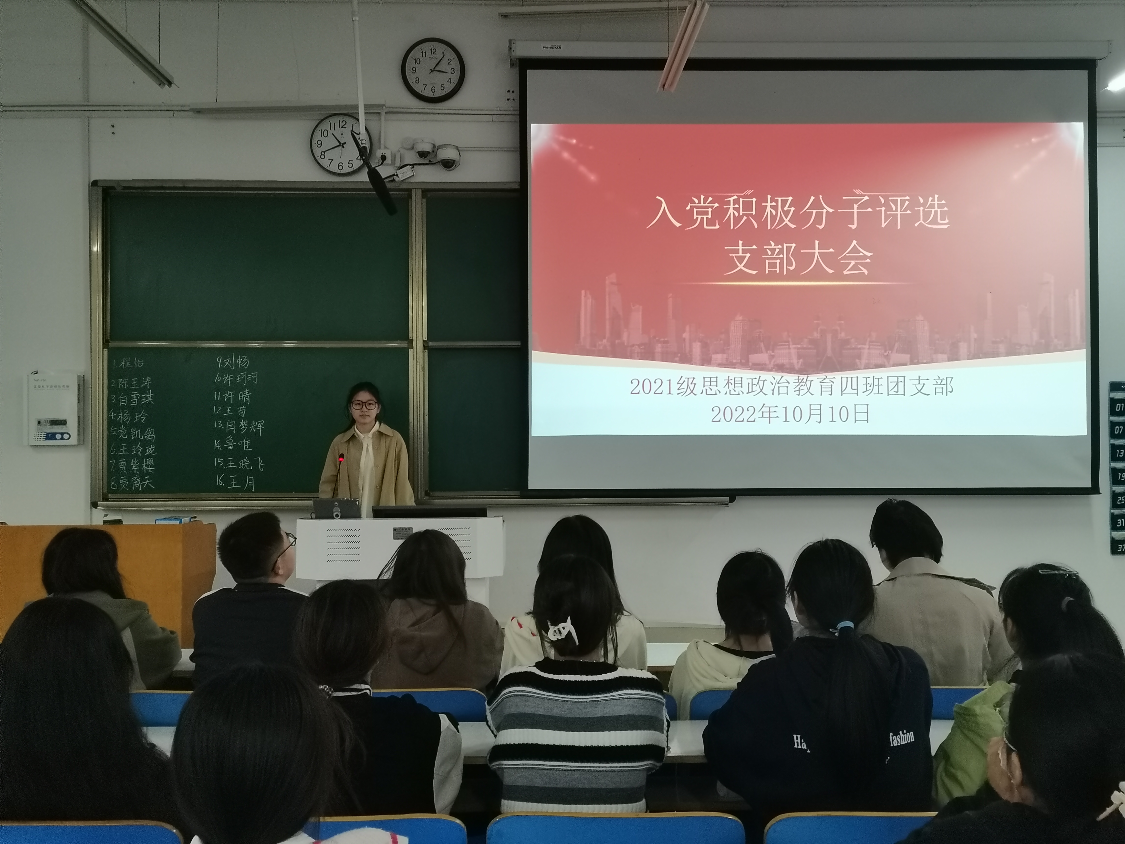 10月10日上午,明升MS88官网2021级思想政治教育四班在社科楼515教室召开入党积极分子评选支部大会。2021级思想政治教育四班全体团员共同参会。会议由团支书刘珂含主持。