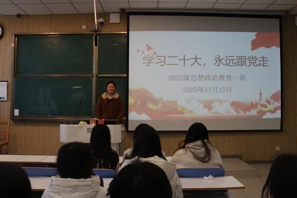 团课伊始,张卓围绕党的二十大报告中关于青年工作的重要论述,强调新时代青年要牢记“坚定不移听党话、跟党走”的重要嘱托。随后,同学们共同观看了主题纪录片《奋进新征程》,从脱贫攻坚、科技创新、生态文明建设等鲜活实践中,直观感受党的二十大以来国家取得的历史性成就。在交流讨论环节,团员代表刘冉分享道:“作为思想政治教育专业的员工,我们更应深耕理论学习,把二十大精神转化为学习动力和行动自觉,未来在教育岗位上传播党的创新理论,以青春之力践行‘永远跟党走’的誓言。”