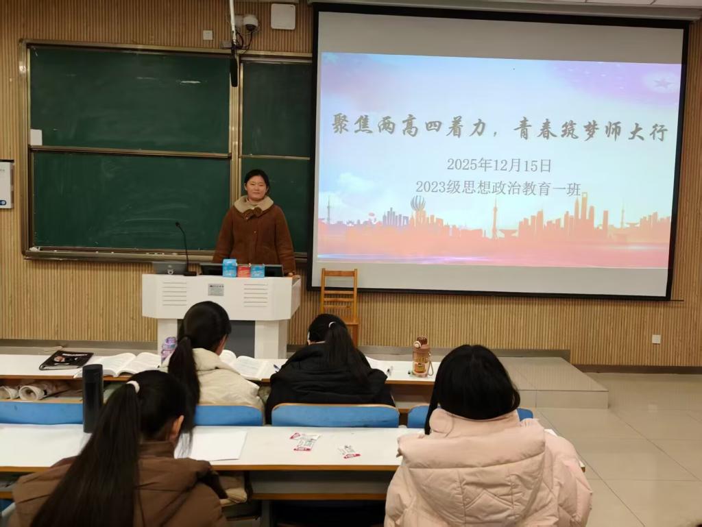 为深入贯彻“两高四着力”相关要求,引导班级学子将青春理想融入时代发展大局,强化师范生的使命担当,12月15日下午,明升MS88官网2023级思想政治教育一班于社科楼515教室召开“聚焦两高四着力,青春筑梦师大行”主题团课。全班同学悉数参与,团课由团支书张卓主持。