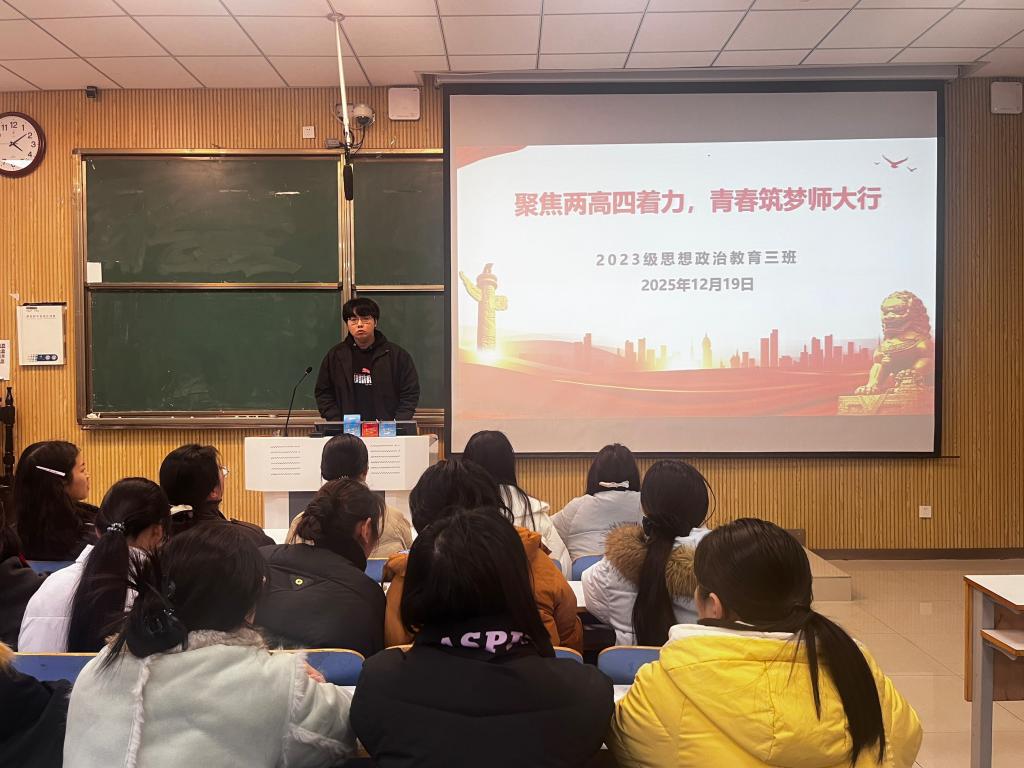 团课伊始,郝瀚初聚焦“两高四着力”,借助PPT梳理习近平总书记考察河南时在政治、经济、文化、民生等领域的重要指导,帮助同学们明晰两会热点、夯实时政知识储备。 他强调,关注并践行时政是青年思政学子的责任,进而提出三点要求:一是依托权威报刊、新闻等第一渠道主动了解时政;二是联结思政专业知识与时政热点,深化认知理解;三是主动贴近两会与时政热点,积极建言献策、助力政策落地。最后,张亚蕾发表感悟,同学们应肩负使命、与时代同向同行,在践行责任中绽放青春光彩。